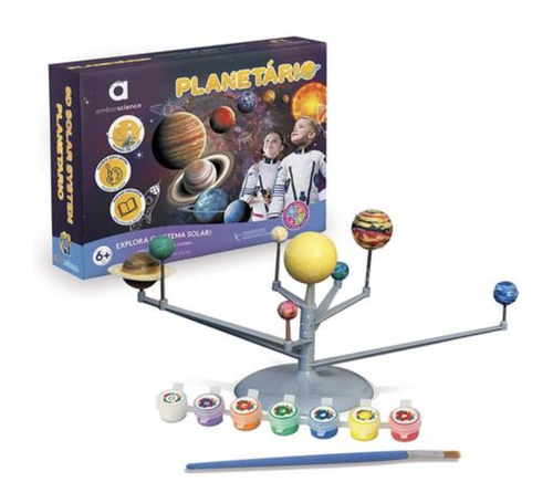 Juego educativo para construir y pintar el sistema solar. Incluye maquetas en 3D del sol y los planetas, guía explicativa y pinturas para decorar.